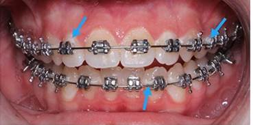 Los dispositivos ortodónticos fijos presentan retos significativos para la higiene oral, ya que sus estructuras favorecen la retención de placa y dificultan su eliminación. La presencia de brackets y arcos metálicos introduce superficies adicionales donde la placa bacteriana se acumula y dificulta el acceso a algunas zonas dentales. Esto resalta la necesidad de una adecuada educación y seguimiento en las prácticas de higiene oral a lo largo del tratamiento ortodóntico. (5) En la figura 1 se presenta la existencia de caries debido a la higiene deficiente durante el tratamiento ortodóntico, con zonas de acúmulo de placa dentobacteriana.