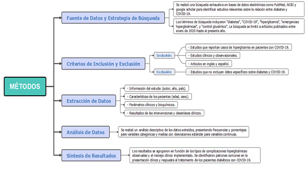 Se recopilaron varios datos sobre el estudio, características de los pacientes, parámetros clínicos y resultados de intervenciones. Luego, se realizó un análisis descriptivo de frecuencias, porcentajes y medias con desviaciones estándar. Finalmente, los resultados se agruparon según las complicaciones hiperglucémicas, el manejo clínico y se identificaron patrones comunes en la respuesta al tratamiento de pacientes diabéticos con COVID-19.