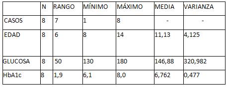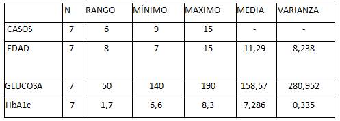 Los valores variaron entre 140 y 190 mg/dL. La media de glucosa en estas niñas fue de 158,57 mg/dL, una varianza de 280,952 lo que indica que los niveles de glucosa variaron significativamente entre las participantes. Los niveles de HbA1c en niñas con diabetes y COVID-19 variaron entre 6,6 % y 8,3 % en siete casos. La media de HbA1c en estas niñas fue de 7,286 %, con una desviación estándar de 0,5786.