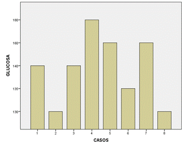 Los niveles de HbA1c en niños con diabetes y COVID-19, según los datos, indica un control glucémico regular, ya que se analizaron 8 casos con niveles de HbA1c que variaron entre 6,1 y 8,0 con una media de 6,762 y una desviación estándar de 0,6906. La figura 2 muestra los niveles de glucosa en niños con diabetes y COVID-19. Según estos datos, se analizaron los niveles de glucosa que oscilaron entre 130 y 180 mg/dL. La media de glucosa en estos niños fue de 146,88 mg/dL, con una desviación estándar de 17,916, lo anterior indica una variabilidad considerable en los niveles de glucosa entre los participantes.